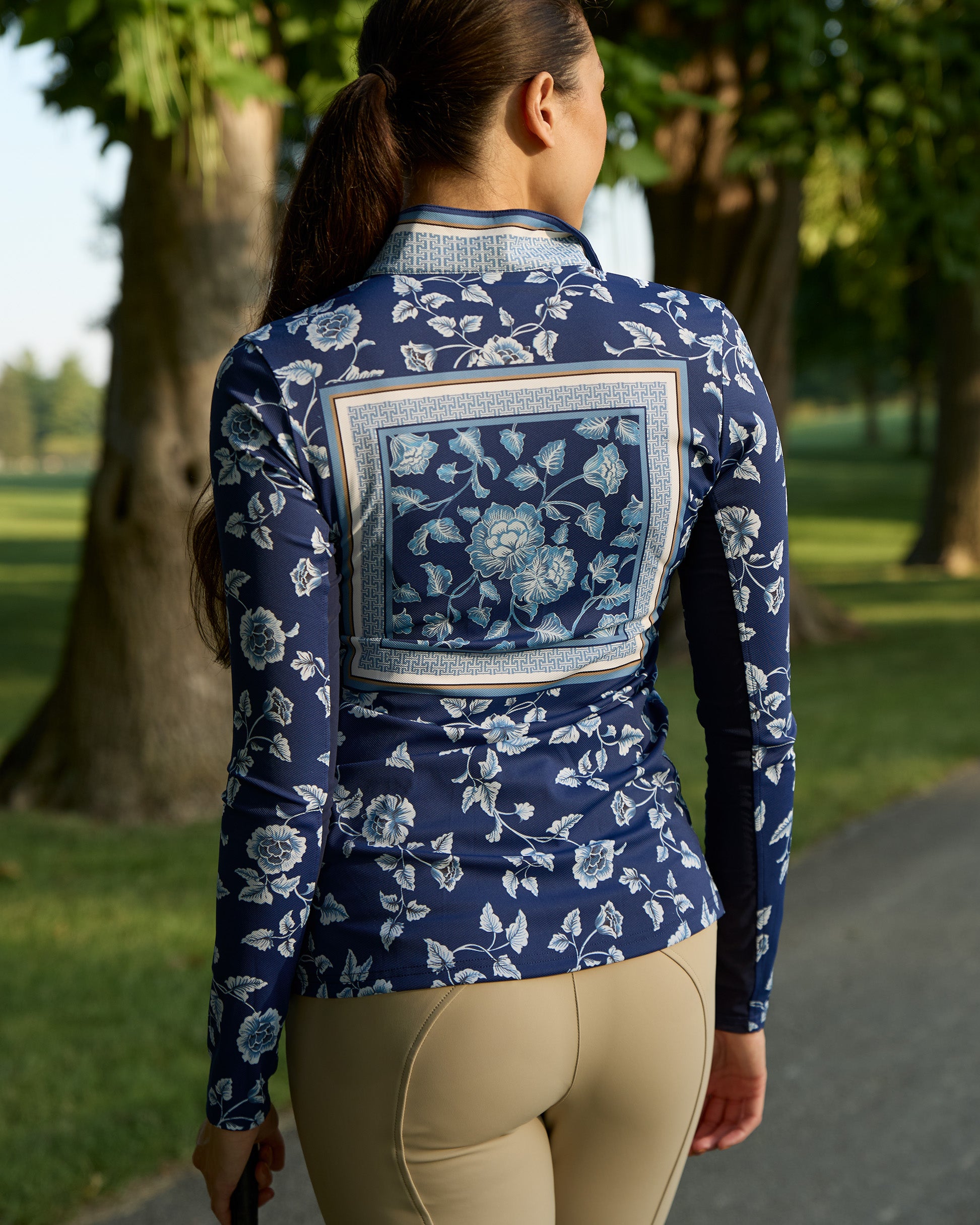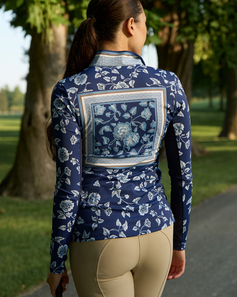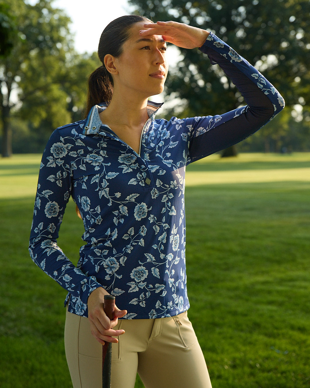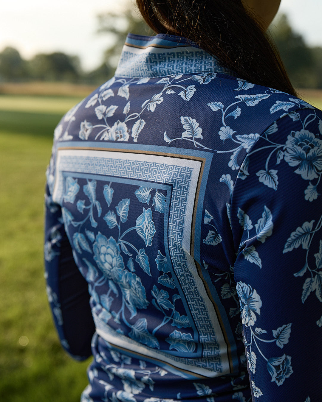 Effortlessly stylish design crafted from wicking performance stretch texture twill fabric for unparalleled comfort and breathability. Inspired by the classic ginger jar porcelain used to transport spices, this sun shirt features a distinctive stripe collar for a crisp break that adds a luxurious finish to the overall print.